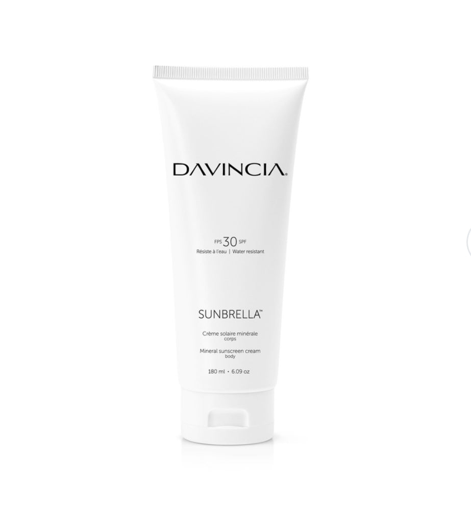 La crĂšme solaire SUNBRELLAℱ corps de Davincia offre une protection minĂ©rale Ă  large spectre SPF 30, conçue pour respecter la peau et l’environnement.